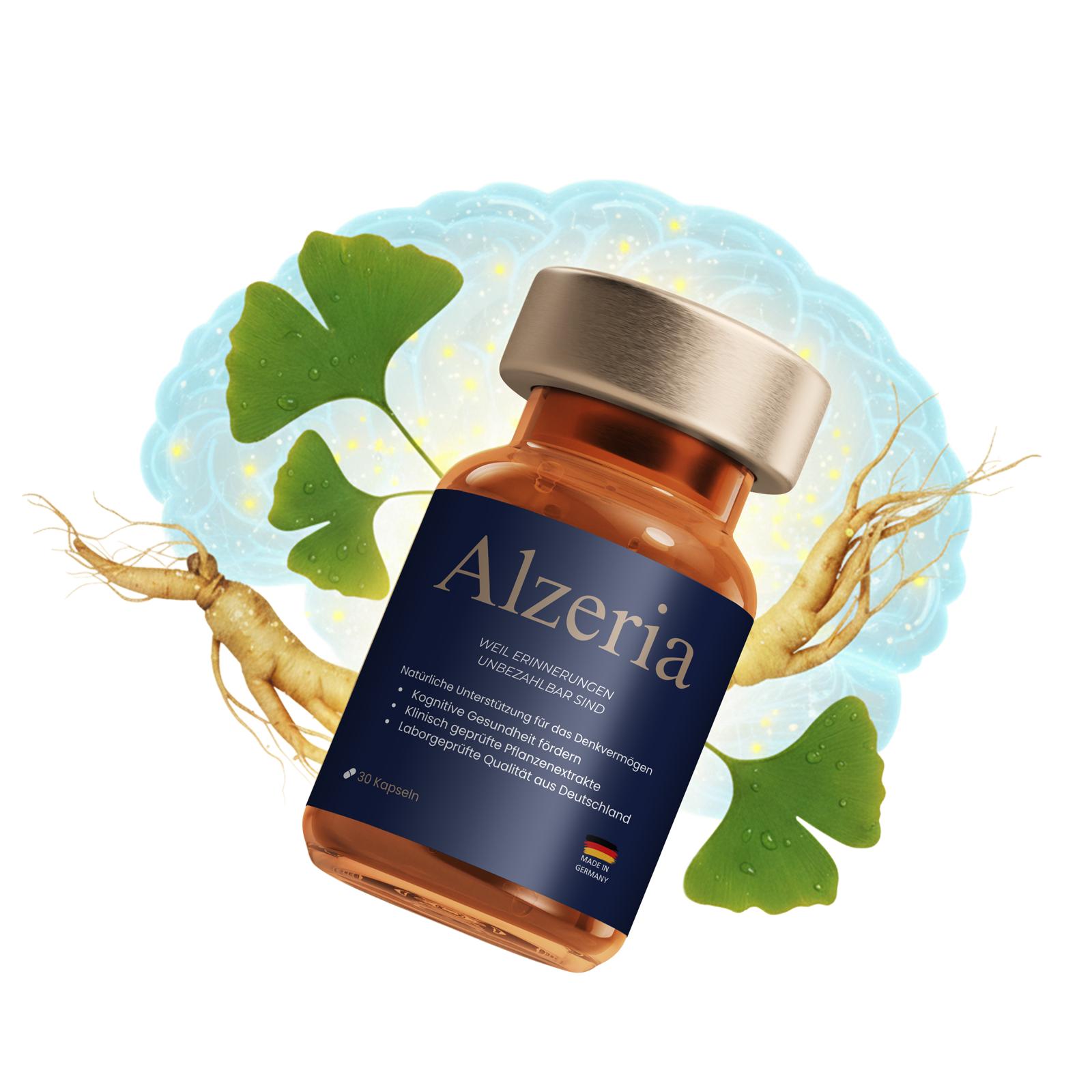 Alzeria® ist ein pflanzliches Nahrungsergänzungsmittel, kein Arzneimittel. Es unterstützt die natürlichen Zellprozesse und die neuronale Kommunikation im Gehirn – entwickelt, um die mentale Vitalität auf natürliche Weise zu fördern.